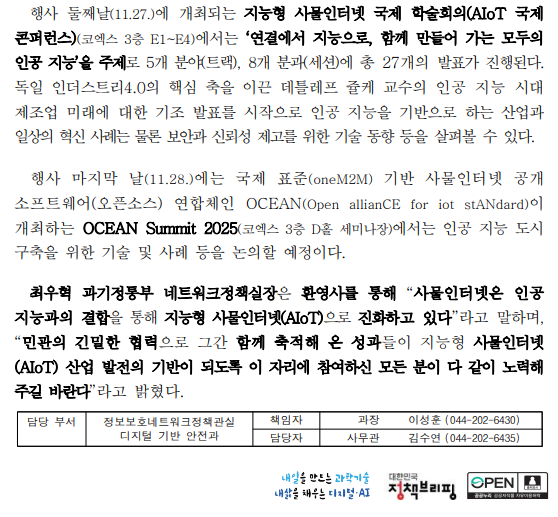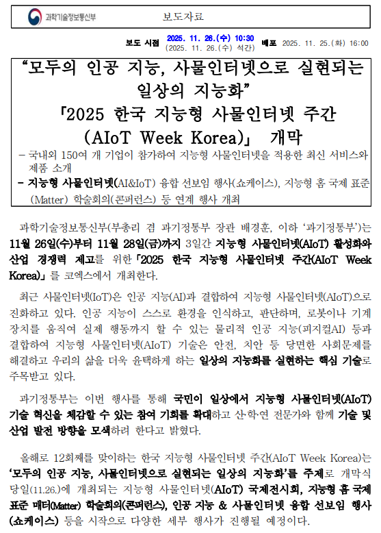 - 251126 석간 보도 「2025 AIoT Week Korea」 개막최종.hwpx (539.9K) 0회 다운로드 | DATE : 2025-11-27 09:46:36
