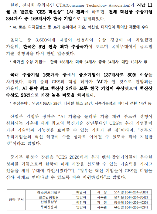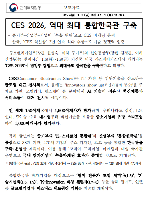 | 제목 | (중기부) CES 2026, 역대 최대 통합한국관 구축 |